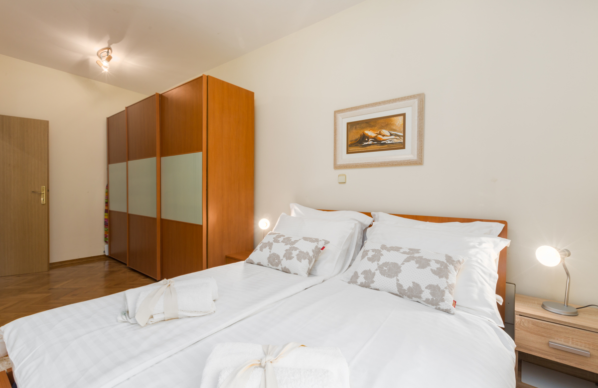 Spavaće sobe: bračni krevet, klima uređaj i TV sa satelitskim programima.